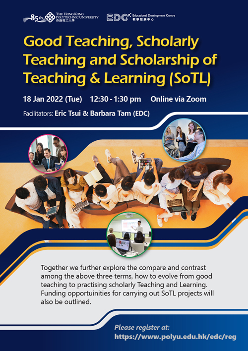 Together we further explore the compare and contrast among the above three terms, how to evolve from good teaching to practising scholarly Teaching and Learning. Funding opportuinities for carrying out SoTL projects will also be outlined.
