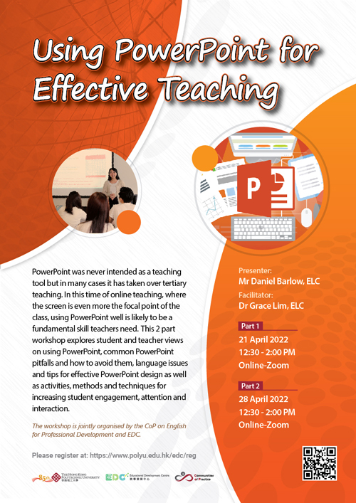 PowerPoint was never intended as a teaching tool but in many cases it has taken over tertiary teaching. In this time of online teaching, where the screen is even more the focal point of the class, using power point well is likely to be a fundamental skill teachers need. This 2 part workshop explores student and teacher views on using PowerPoint, common PowerPoint pitfalls and how to avoid them, language issues and tips for effective PowerPoint design as well as activities, methods and techniques for increasing student engagement, attention and interaction.