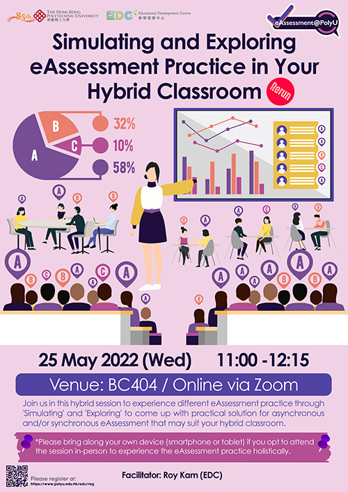Join us in this hybrid session to experience different eAssessment practice through 'Simulating' and 'Exploring' to come up with practical solution for asynchronous and/or synchronous eAssessment that may suit your hybrid classroom.