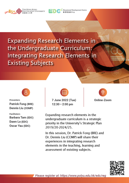 Expanding research elements in the undergraduate curriculum is a strategic priority in the University’s Strategic Plan 2019/20-2024/25. In this session, Dr. Patrick Fong (BRE) and Dr. Dennis Liu (COMP) will share their experiences in integrating research elements in the teaching, learning and assessment of existing subjects.