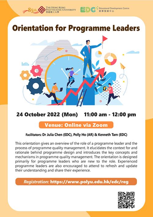 This orientation gives an overview of the role of a programme leader and the process of programme quality management. It elucidates the context for and rationale behind programme design and introduces the key concepts and mechanisms in programme quality management. The orientation is designed primarily for programme leaders who are new to the role. Experienced programme leaders are also encouraged to attend to refresh and update their understanding and share their experience.
