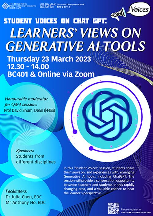 In this ‘Student Voices’ session, students share their views on, and experiences with, emerging Generative AI tools, including ChatGPT. The session will provide a conversation opportunity between teachers and students in this rapidly changing area, and a valuable chance to hear the learner's perspective.