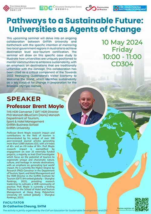 This upcoming seminar will delve into an ongoing collaboration between Griffith University and Earthcheck with the specific intention of mentoring two local government regions in Australia to achieve destination level eco-tourism certification. The seminar will draw on this specific case study to illustrate how universities are uniquely positioned to mentor communities to embrace sustainability, with an emphasis on destinations that are traditionally unfamiliar with the concept. This collaboration has been cited as a critical component of the 'Towards 2032: Reshaping Queensland's Visitor Economy to Welcome the World', which identifies sustainability as a key catalyst for change in preparation for the Brisbane Olympic Games.