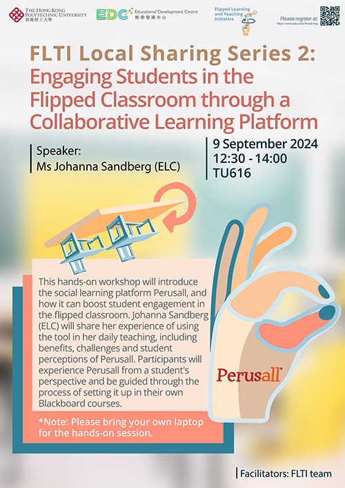 This hands-on workshop will introduce the social learning platform Perusall, and how it can boost student engagement in the flipped classroom. Johanna Sandberg (ELC) will share her experience of using the tool in her daily teaching, including benefits, challenges and student perceptions of Perusall. Participants will experience Perusall from a student's perspective and be guided through the process of setting it up in their own Blackboard courses.