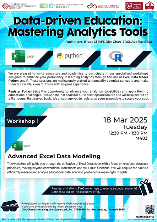 This workshop will guide you through the utilisation of Excel Data Model with a focus on relational database principles, moving beyond conventional worksheets and VLOOKUP functions. You will acquire the skills to efficiently manage and analyse educational data, enabling you to derive meaningful insights.