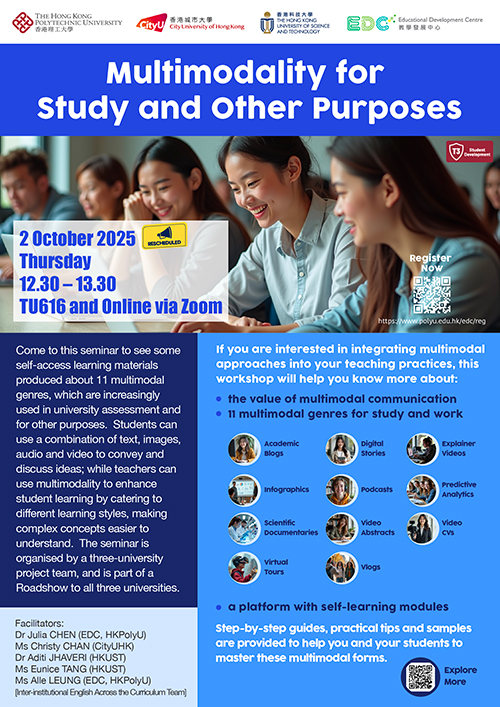 Come to this seminar to see some self-access learning materials produced about 11 multimodal genres, which are increasingly used in university assessment and for other purposes. Students can use a combination of text, images, audio and video to convey and discuss ideas; while teachers can use multimodality to enhance student learning by catering to different learning styles, making complex concepts easier to understand. The seminar is organised by a three-university English Across the Curriculum project team, and is part of a Roadshow to all three universities.