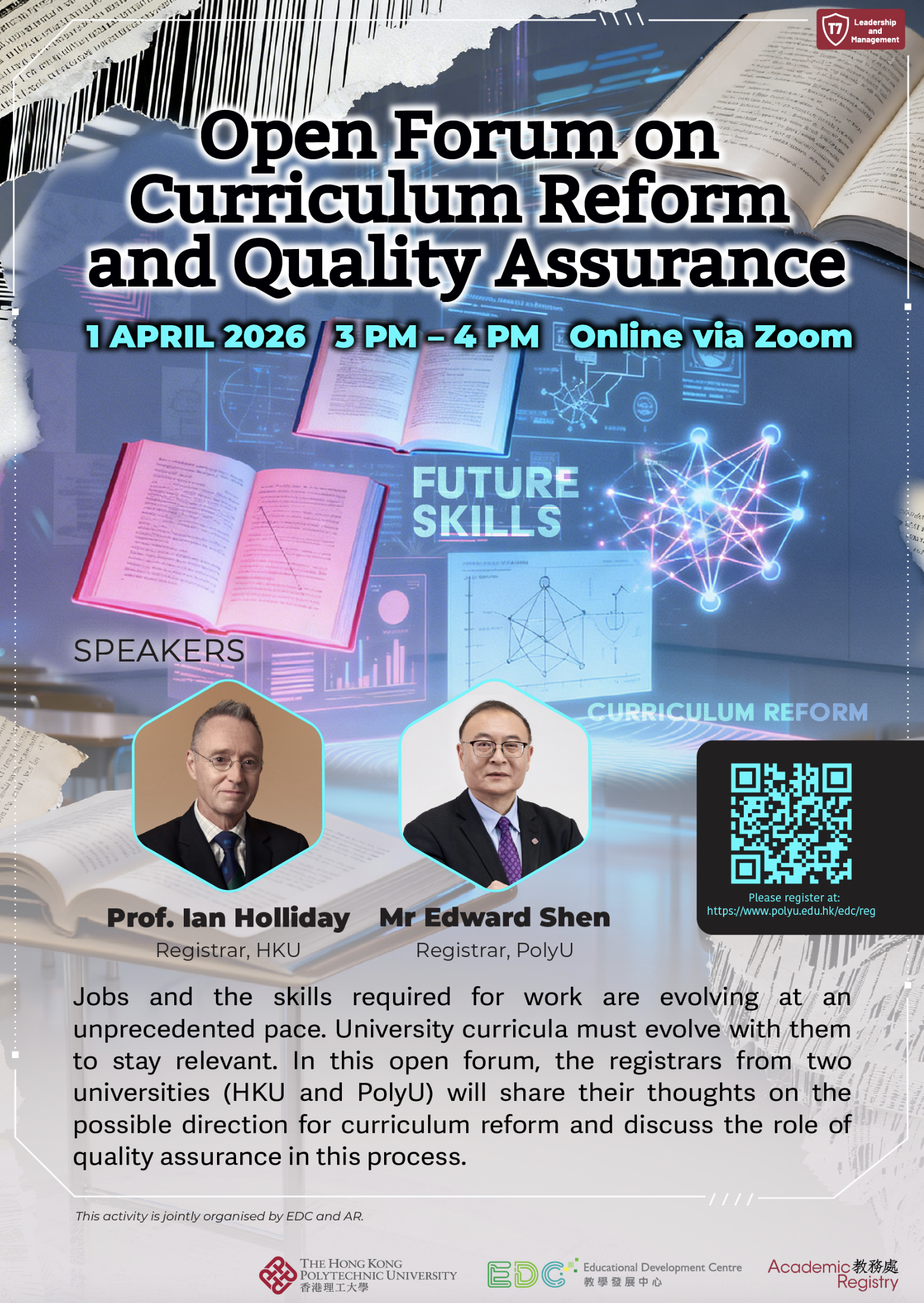 Jobs and the skills required for work are evolving at an unprecedented pace. University curricula must evolve with them to stay relevant. In this open forum, the registrars from two universities (HKU and PolyU) will share their thoughts on the possible direction for curriculum reform and discuss the role of quality assurance in this process.
