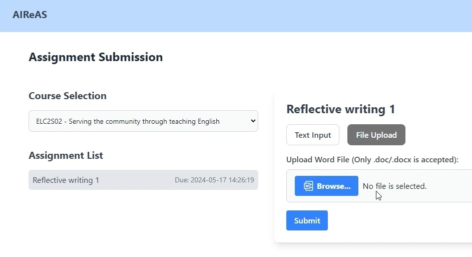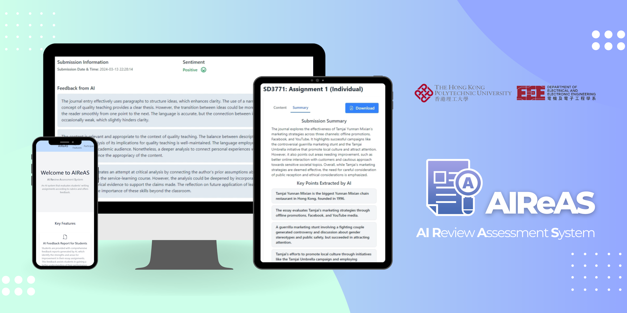 AIReAS is an advanced AI-assisted review assessment system designed to streamline the assessment of students’ essay assignments. By integrating cutting-edge GenAI technology, AIReAS provides valuable feedback on English essays across various curricula, highlighting strengths and areas for improvement.