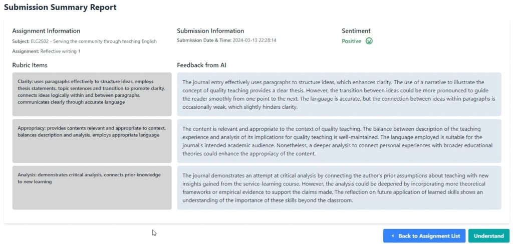 Students can submit their assignments in either plain text or Word document format. Upon submission, AIReAS‘s GenAI technology analyzes the sentiment and crafts tailored feedback, helping students refine their writing skills.