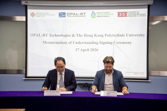 The Research Centre for Grid Modernisation at the Hong Kong Polytechnic University (PolyU) and OPAL-RT Technologies, a global leader in real-time digital simulation, officially signed a Memorandum of Understanding (MoU) on 17 April 2026 to establish a Joint Laboratory, marking the beginning of a strong collaborative partnership. This partnership combines PolyU's world-class academic strengths in power systems with OPAL-RT Technologies' industrial expertise in Hardware-in-the-Loop (HIL) simulation, advancing cutting-edge research and innovative applications in key areas such as power system stability and control, inverter-based resources, smart grid, and other next-generation power engineering technologies. The collaboration aims to drive the digital and intelligent transformation of grids and contribute to sustainable energy development in Hong Kong, the Greater Bay Area, and beyond.