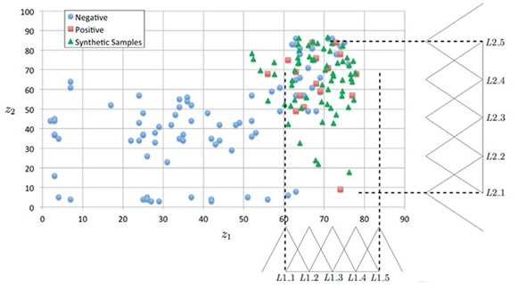 Distribution of the samples after over-sampling. The y-axis represents the values of z2 and x-axis represents the value of z1