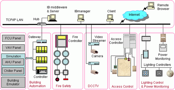 The Honeywell IB System consists of a BA panel, a security and access control panel, a fire safety panel and a lighting control panel integrated on IP network. The Johnson Controls BMS consists of BA subsystem, security and CCTV subsystem, power analysis and the FCU and VAV panels, and the simulation panels of chilling plant and AHU. The security and access controls, lighting control and energy monitoring of the laboratory space are integrated into the test facilities. All subsystems are remotely accessible on Internet.