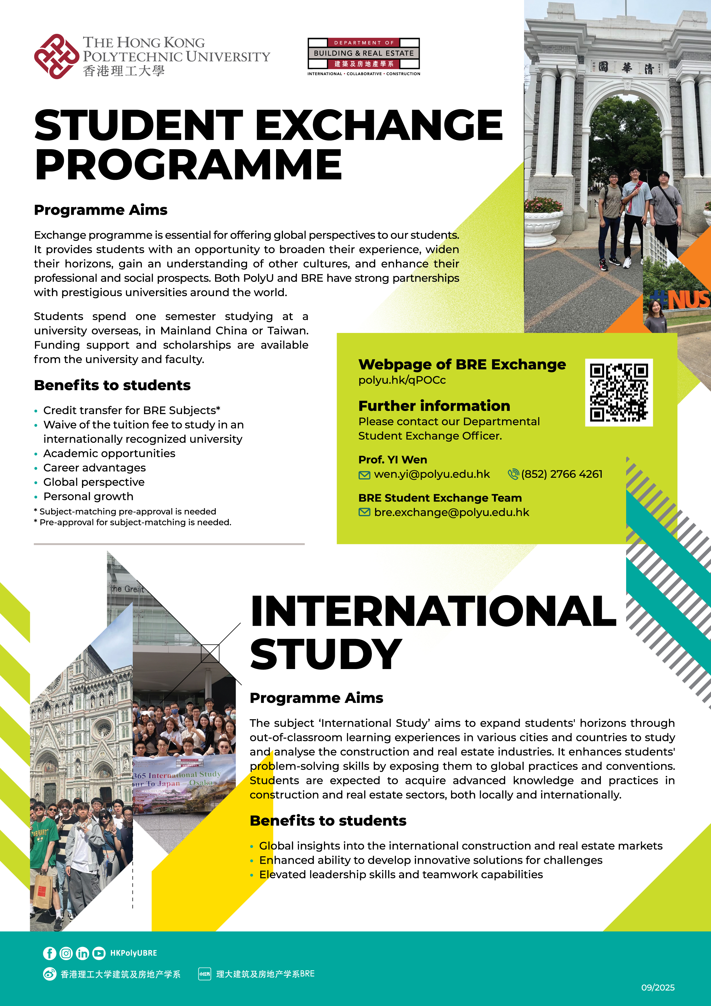 1. ALL full-time UGC-funded undergraduate students are eligible to apply for outbound exchange programme for one semester. BRE and PolyU partner with a wide range of universities in UK, USA, Canada, Australia, Singapore, Korea, Japan, Taiwan and Mainland China.