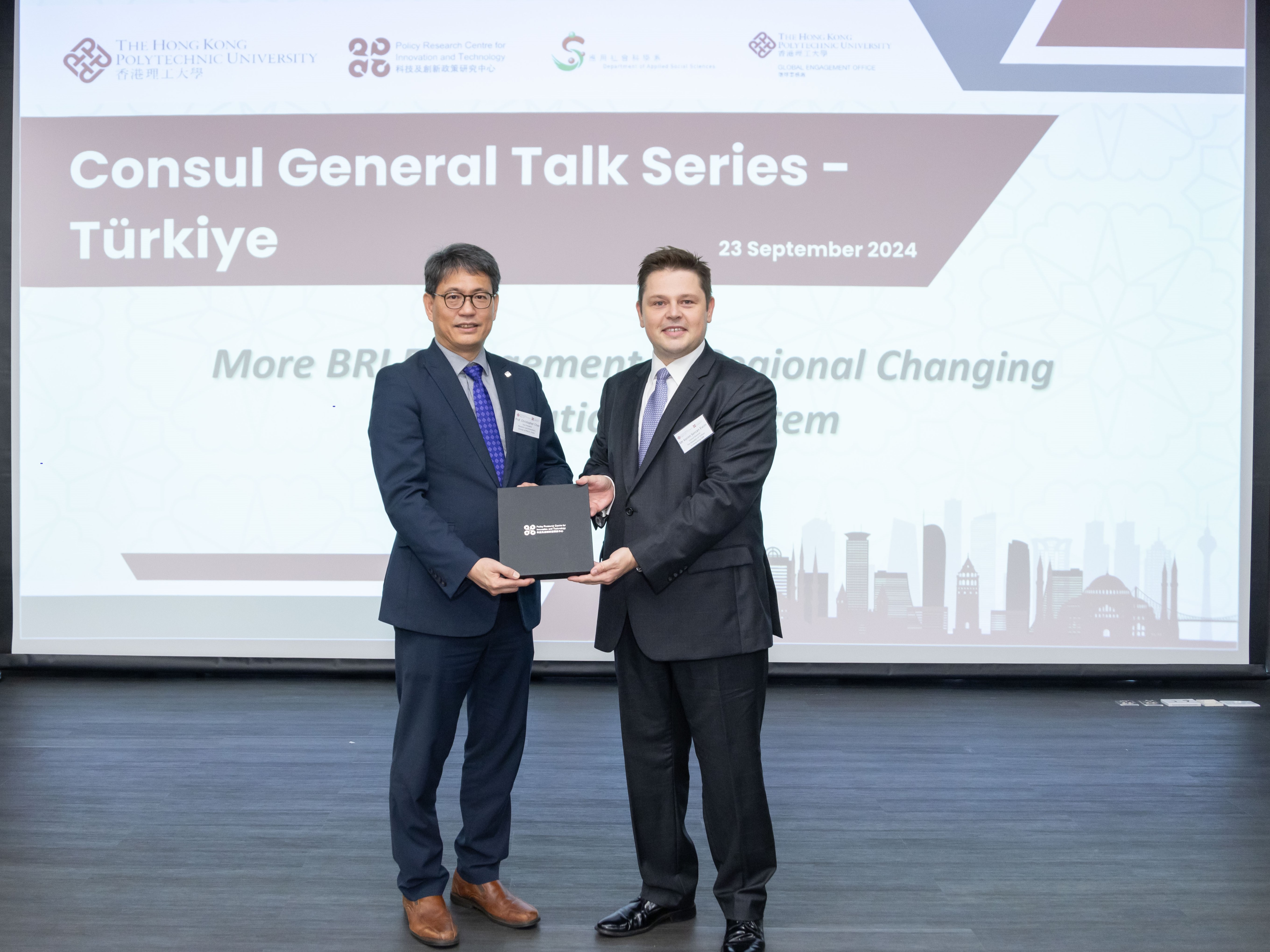 The talk was also attended by distinguished guests including Mr Nicholas HO, Commissioner for Belt and Road of the Government of HKSAR, and Mr Uğur Öztürk, Consul of the Republic of Türkiye in HKSAR, together with Prof. Christopher CHAO, PolyU Vice President (Research and Innovation) and Director of PReCIT; Prof. Geoffrey SHEN, PolyU Associate Vice President (Global Partnerships); and Dr Laura LO, PolyU Associate Vice President (Institutional Advancement).
