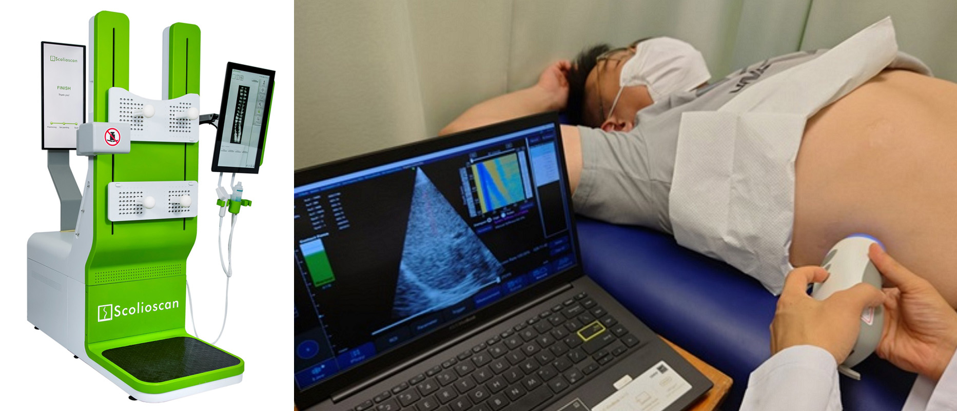 Scolioscan® (on left) can measure spinal curve as accurately as X-ray while Liverscan® (on right) helps detect liver fibrosis and fatty liver.
