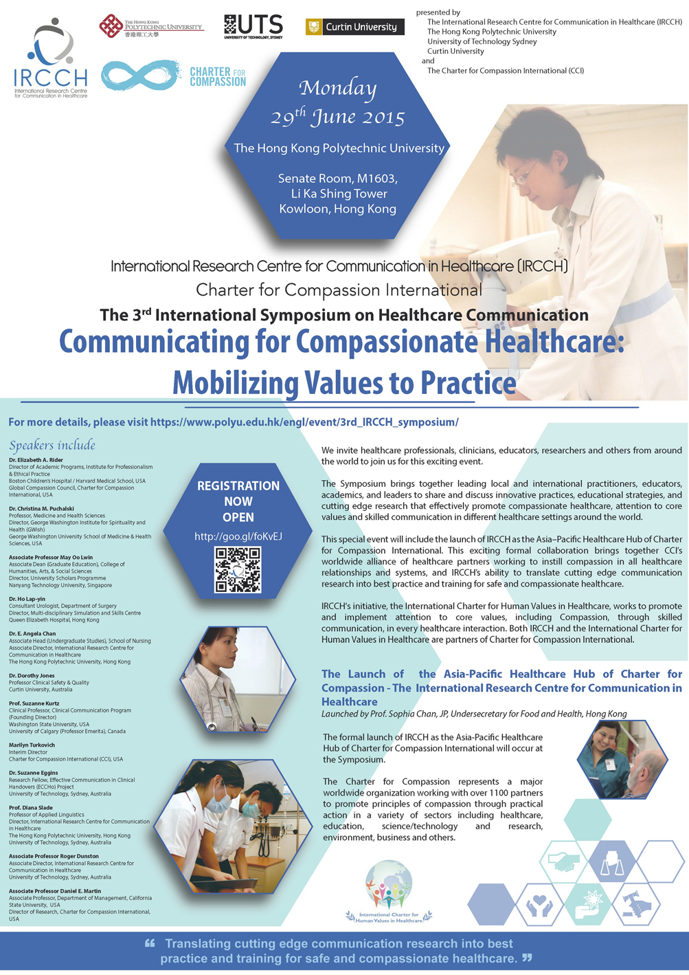 The formal launch of IRCCH as the Asia-Pacific Healthcare Hub of Charter for Compassion International will occur at the Symposium. This exciting formal collaboration brings together CCI’s worldwide alliance of healthcare partners working to instill compassion in all healthcare relationships and systems, and demonstrate IRCCH’s ability to translate cutting edge communication research into best practice and training for safe and compassionate healthcare.