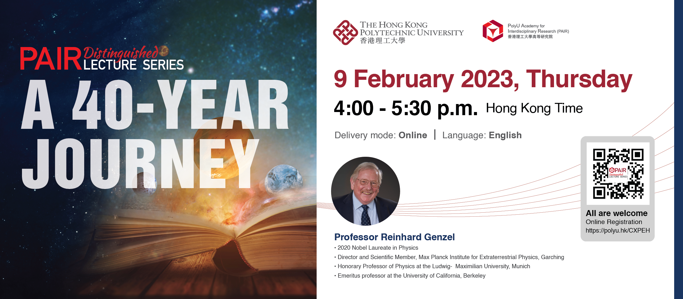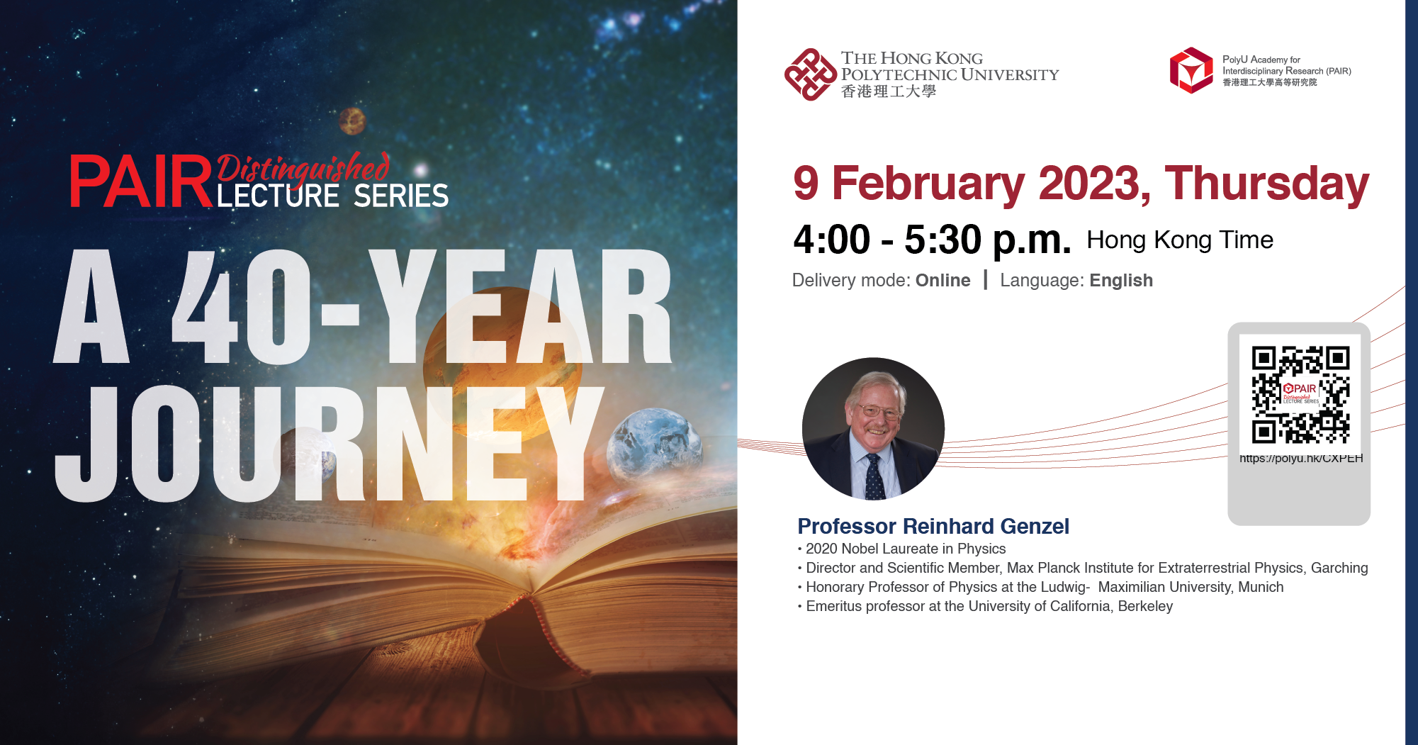 香港理工大學高等研究院誠邀大家參加於二零二三年二月九日(星期四)舉行的PAIR傑出講座。 是次講題為「我的四十年天文科研旅程」,並由2020年諾貝爾物理學獎得主丶馬克斯.普朗克地外物理研究所所長兼科學家賴因哈德.根策爾教授主講。