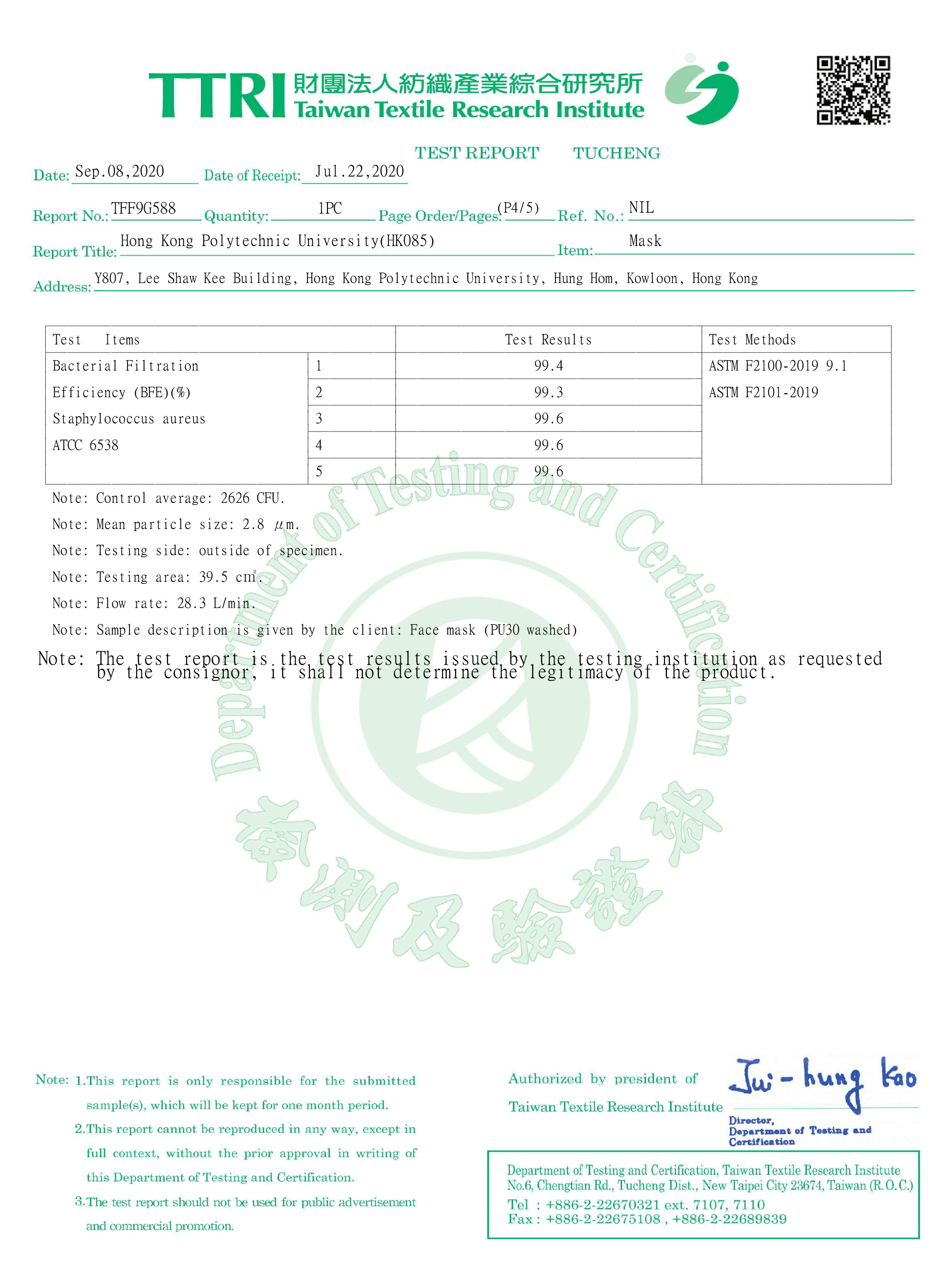 This reusable face mask inhibits tested strains of influenza virus (H1N1) and the Novel Coronavirus (COVID-19) on contact with the surface of the face mask in laboratory (in-vitro) tests. However, correlation between in-vitro testing results and any clinical event has not been established.