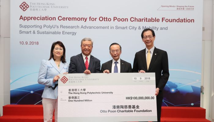 PolyU has received a generous donation of HK$100 million from Ir Dr Otto Poon Lok-to, Founder and Chairman of ATAL Engineering Group, to support the University's strategic research endeavors in areas related to smart city and smart mobility, as well as smart and sustainable energy. The University will then establish two research institutes and two endowed professorships for related disciplines under his name. The institute set up for research in areas related to smart city and smart mobility will work on developing frontier technologies with a focus on smart mobility, especially for aging and densely populated urban environment. Meanwhile, the institute set up for research in areas related to smart and sustainable energy will advance the University's interdisciplinary strength with a focus on sustainable energy conversion, storage, and utilization.