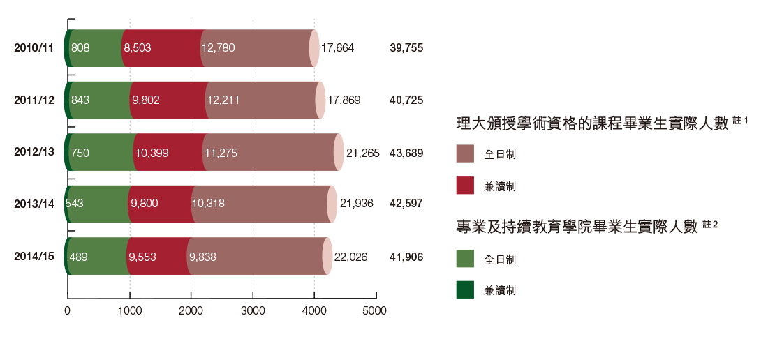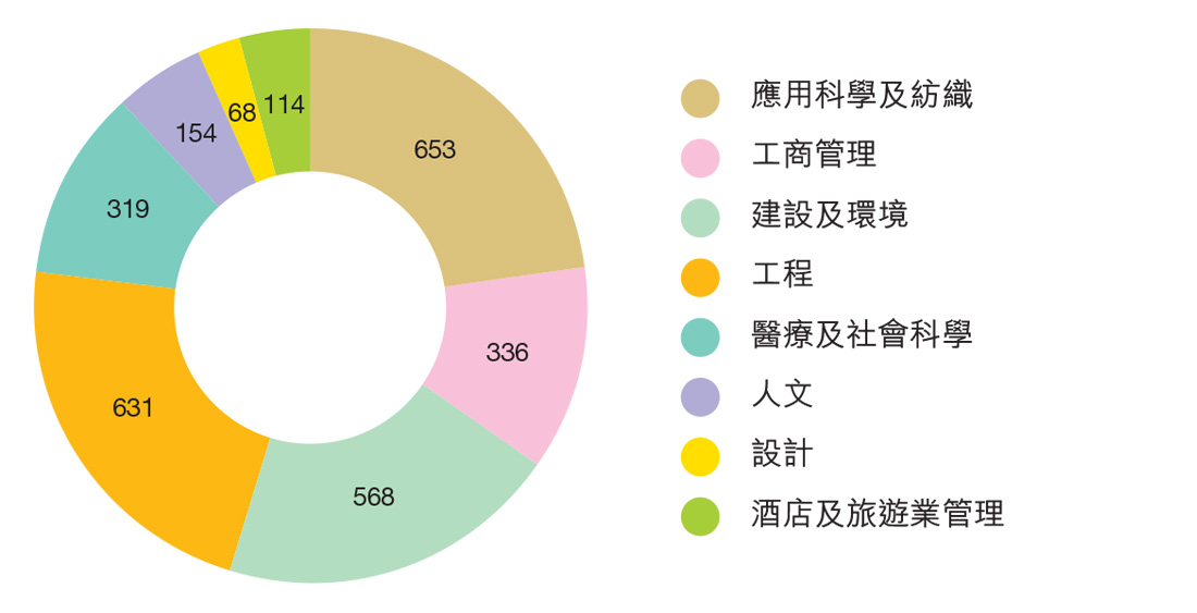 理大設有 26 個教學單位,分屬六個學院:應用科學及紡織學院、工商管理學院、建設及環境學院、工程學院、醫療及社會科學院及人文學院,另有設計學院、酒店及旅遊業管理學院及兩個教學中心。理大在 2014/15 年度共提供 185 個授課式課程,包括博士課程、碩士課程、學士課程及其他非學位課程。理大在本年度於研究及創新方面地位超卓,有逾 2,800 個進行中的研究項目,而獲得校內及校外的撥款總額由 2013/14 年度約 13.811 億港元躍升至 18.322 億港元。