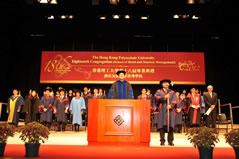 SHTM faculty members, students and their families celebrated new beginnings on 16 November 2012 when PolyU held its 18th Congregation (SHTM) at the Jockey Club Auditorium. The Congregation spanned three sessions, with 7 Ph.D., 6 D.HTM, 7 MPhil, 108 MSc, 1 PgD, 404 BSc, 49 BA and 211 HD graduates receiving their well-earned degrees and diplomas.