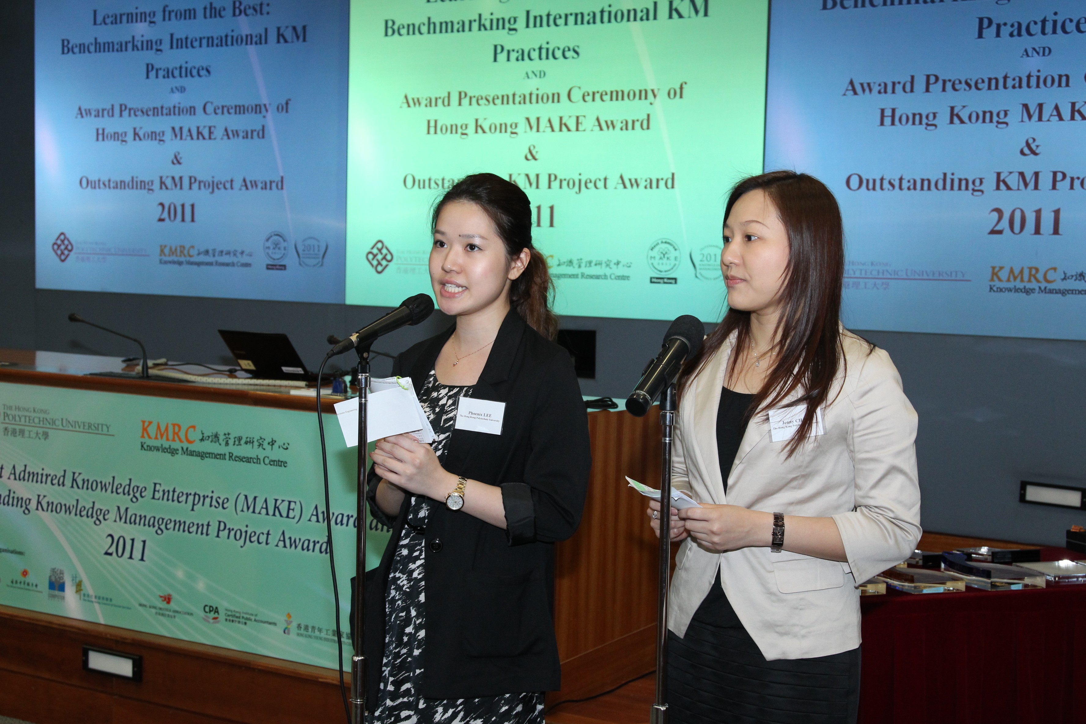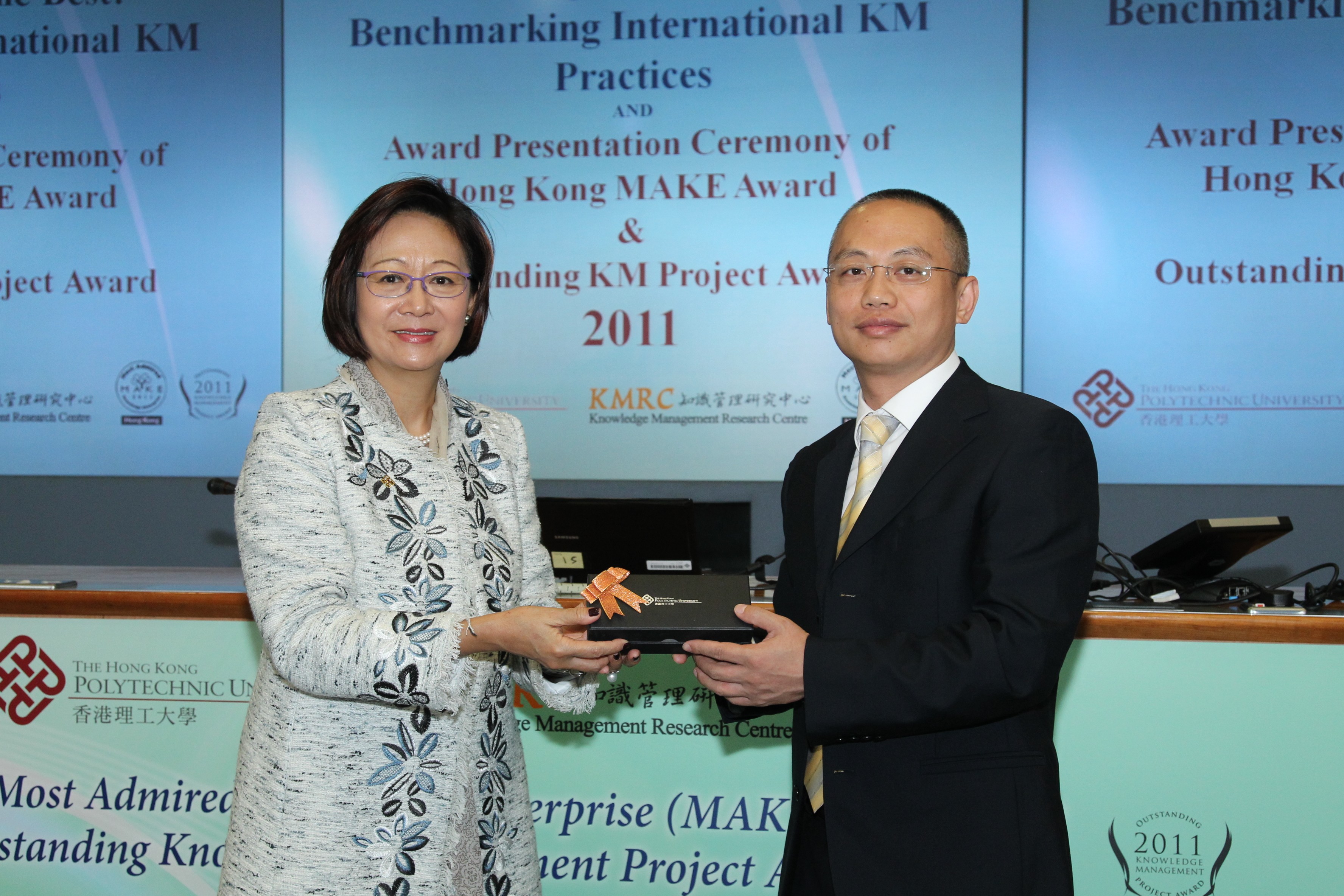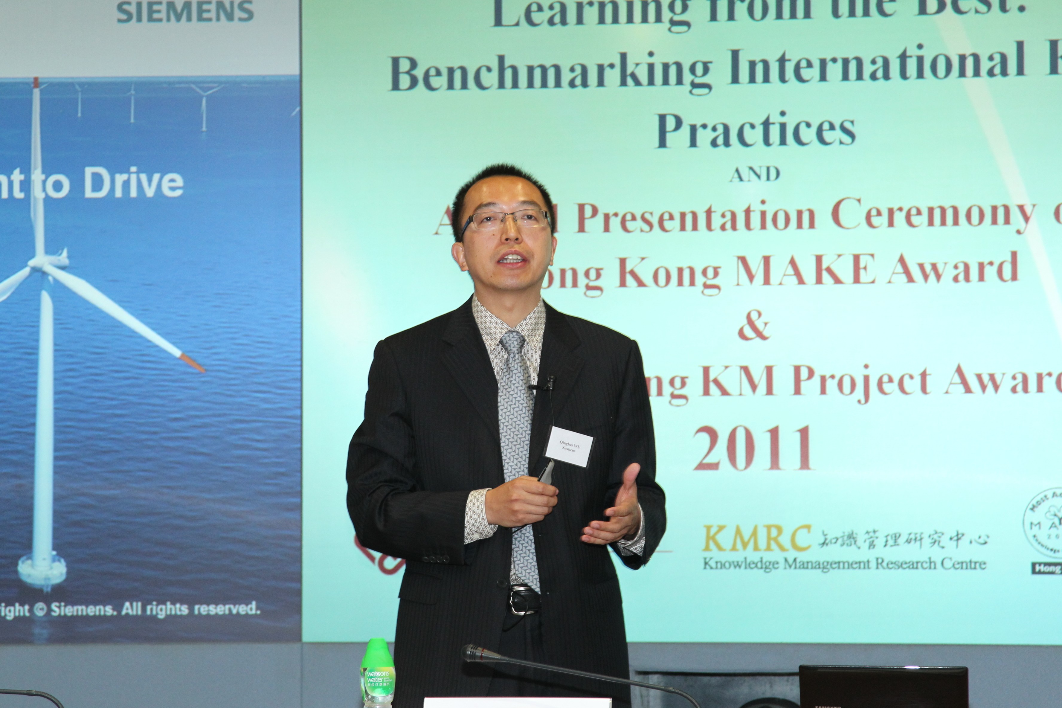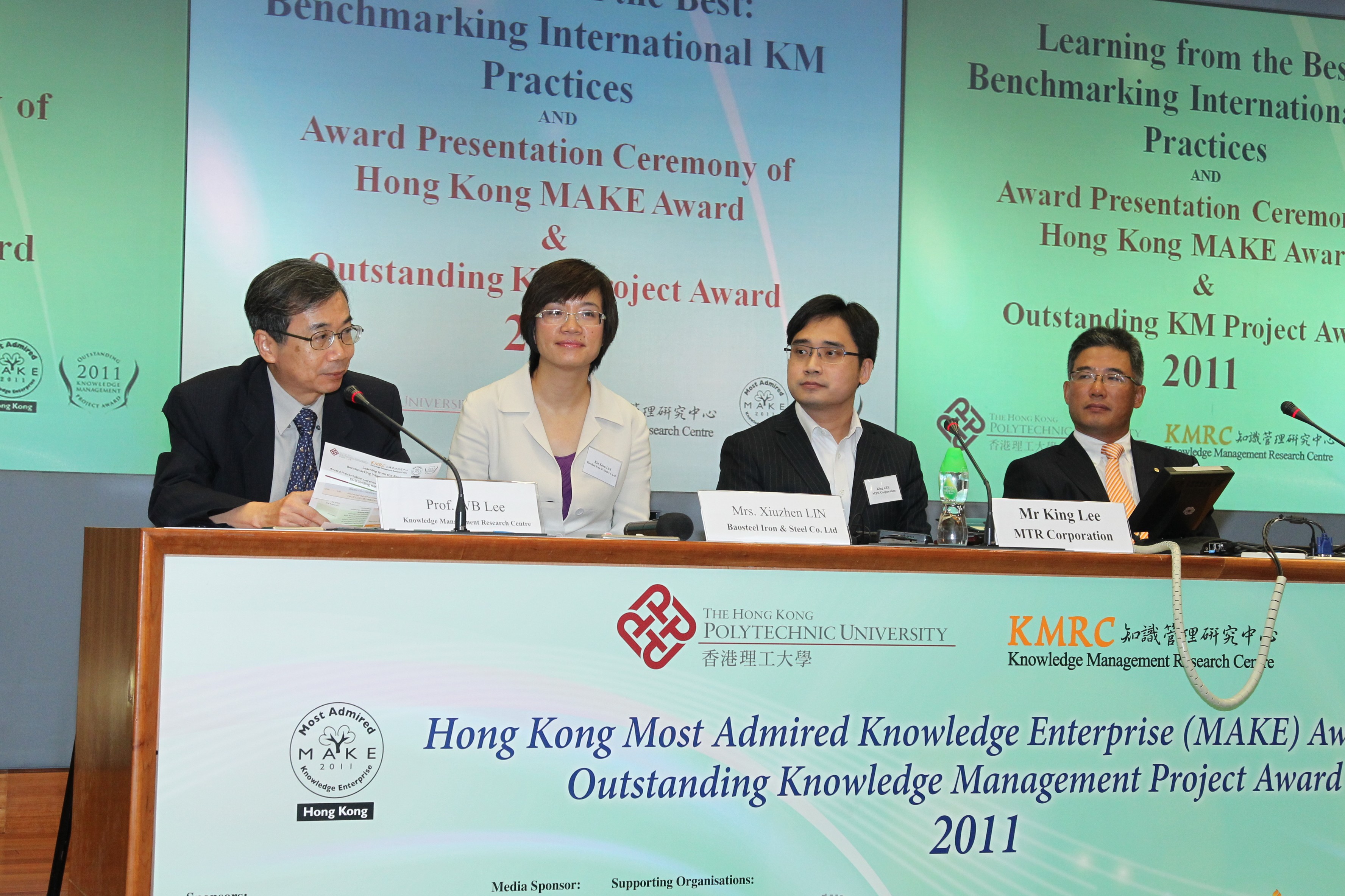 The Hong Kong Most Admired Knowledge Enterprise (MAKE) Award organized by the Knowledge Management Research Centre (KMRC) has come to its fourth year. This year, alongside the award presentation ceremony, a Forum on “Learning from the Best: Benchmarking International KM Practices” was also held on 8 November 2011 at PolyU. For the first time, winners of the Most Admired Knowledge Enterprise (MAKE) Award from Mainland China together with the Hong Kong MAKE winners shared their stories on how they cultivate and utilize the knowledge and intangibles of their staff and stakeholders for the creation of new products and services as well as how to enhance their performance through concerted effort of their employees. The event is well received with over 100 attendees. It ended with a networking session in which all participants enjoyed a wonderful time to discuss and exchange ideas with award recipients.