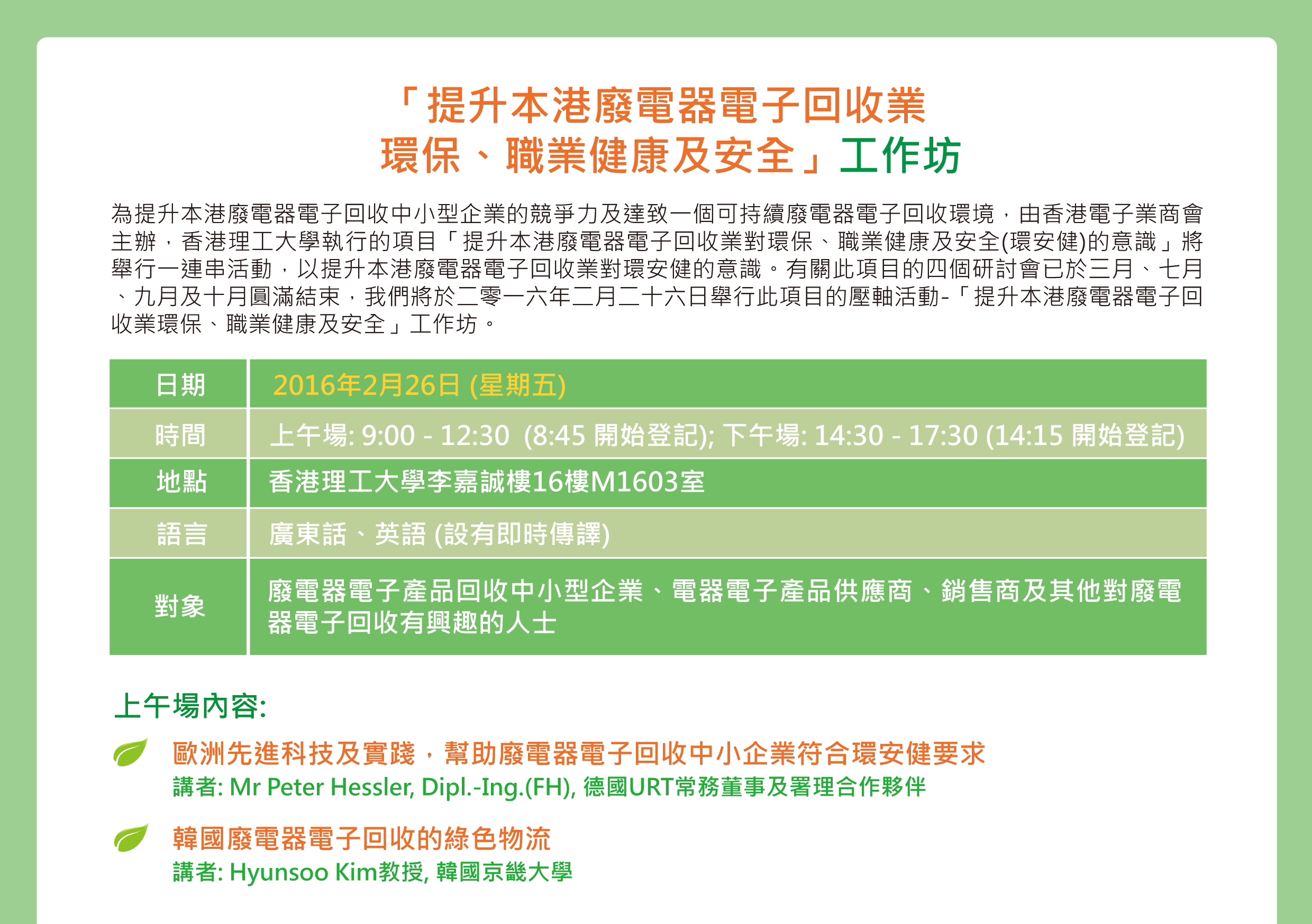 「提升本港廢電器電子回收業對環保、職業健康及安全的意識」項目壓軸活動 「提升本港廢電器電子回收業環保、職業健康及安全」工作坊 (26/2/2016) 「Enhancing the Environment, Health and Safety (EHS) of the WEEE Recycling Industry in HK」- Feb Workshop (26/2/2016)