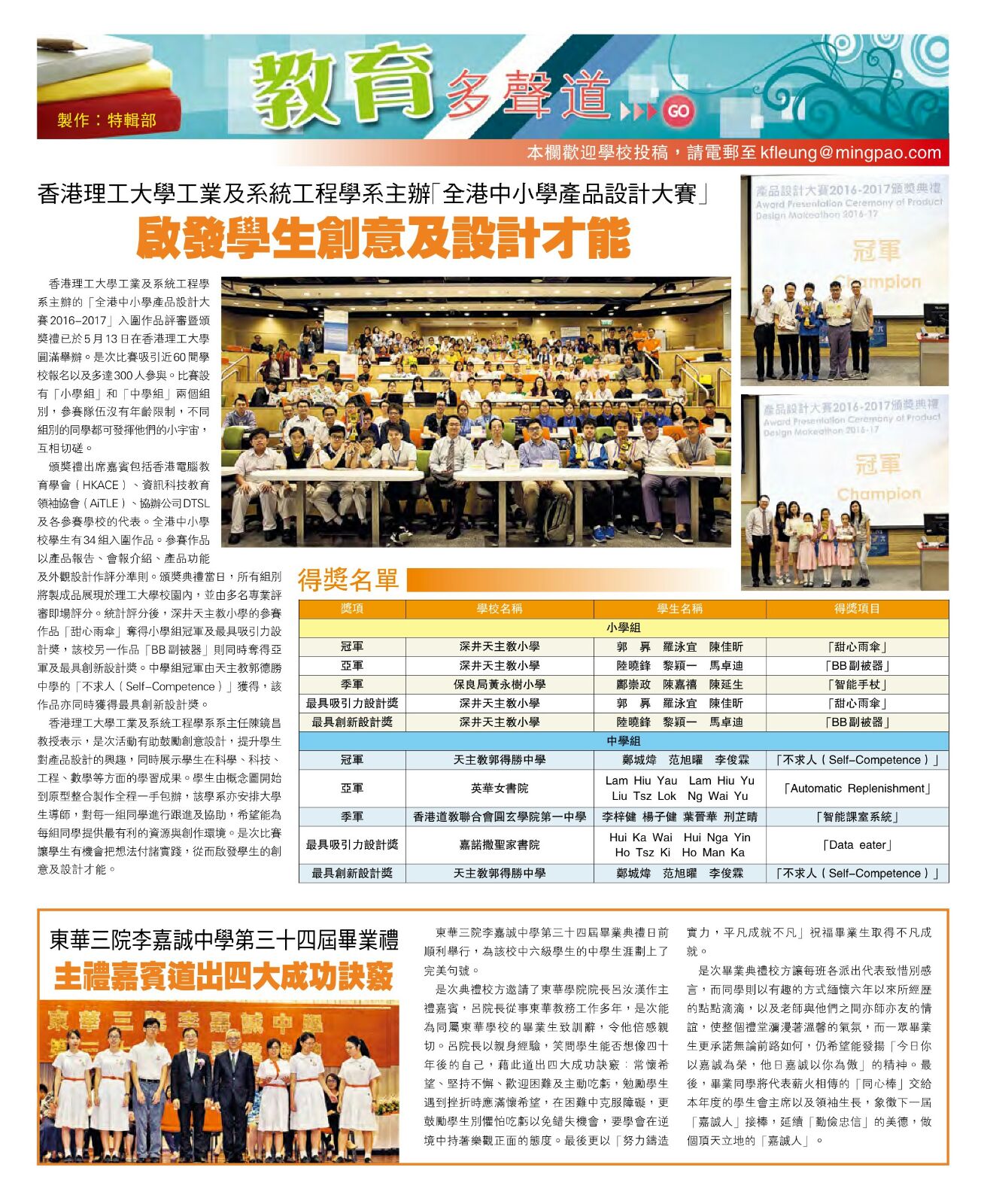 香港理工大學工業及系統工程學系主辦的「全港中小學產品設計大賽2016-2017」入圍作品評審暨頒獎禮已於2017年5月13日在香港理工大學圓滿舉辦。是次比賽吸引近60間學校報名以及多達300人參與。比賽設有「小學組」和「中學組」兩個組別,參賽隊伍沒有年齡限制,不同組別的同學都可發揮他們的小宇宙,互相切磋。