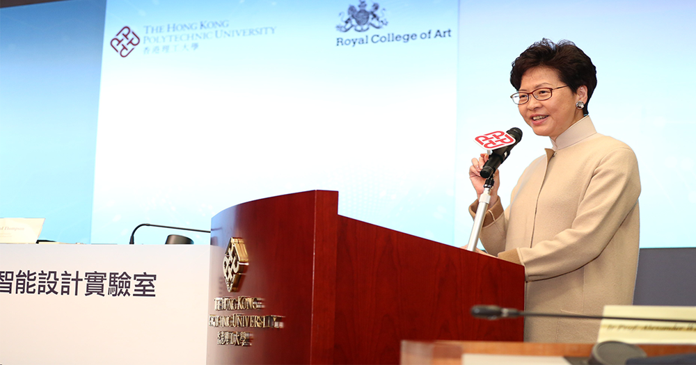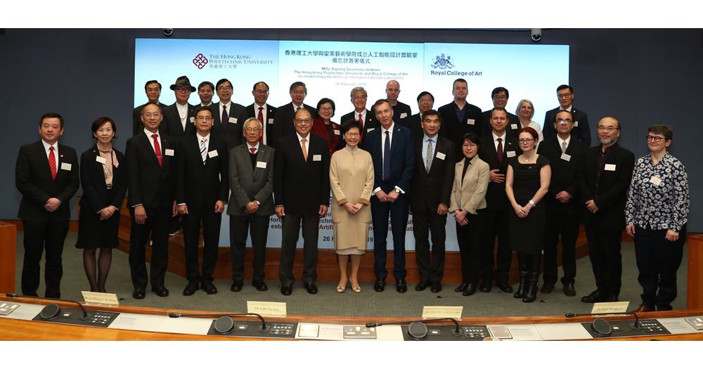 Addressing in the ceremony, The Hon Mrs Carrie Lam, said, “The opportunity to witness this marriage of design and AI which belongs to the technology portfolio is extremely gratifying. I am sure that the collaborated team of PolyU and RCA will find in Hong Kong the appeal of time-tested legal system, robust intellectual property protection, strong financial sector, and the support for commercialisation of R and D results, as well as the distinctive east meets west culture which sparks creative inspiration.”