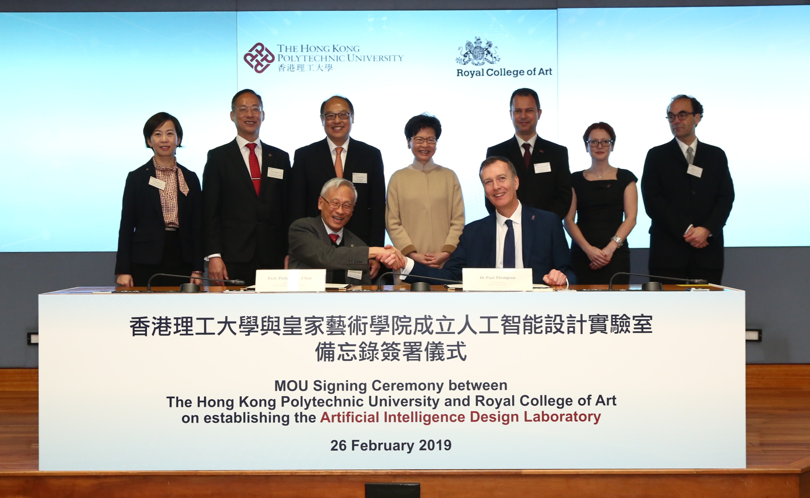 The Hong Kong Polytechnic University (PolyU) and the Royal College of Art (RCA), United Kingdom, today signed a Memorandum of Understanding (MoU) to confirm their intention to establish the PolyU|RCA Artificial Intelligence Design Laboratory (AIDL). The Laboratory will be the world’s first and leading research facility to advance the integration of Artificial Intelligence (AI) into the design of products and service. Targeted to uncover knowledge and techniques related to design and scientific principles, new design process and innovative products, AIDL will address industry demands for efficiency, automation and customising products and services in the innovation and technology era. Its research deliverables will support industries including healthcare, manufacturing, hospitality and retail services.