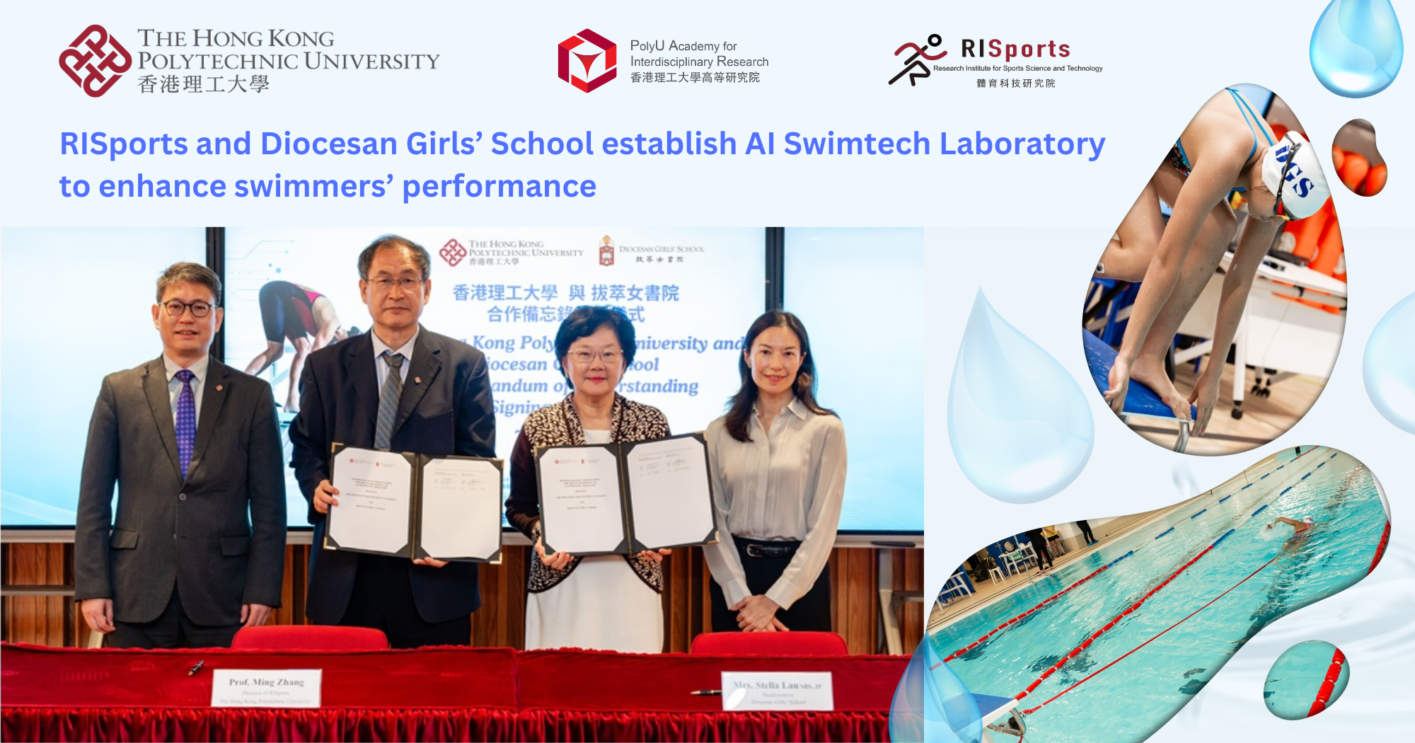 The Research Institute for Sports Science and Technology (RISports) and Diocesan Girls’ School (DGS) have entered into a Memorandum of Understanding to jointly establish the “PolyU–DGS AI Swimtech Laboratory” to catalyse joint research in the fields of sports science and technology.