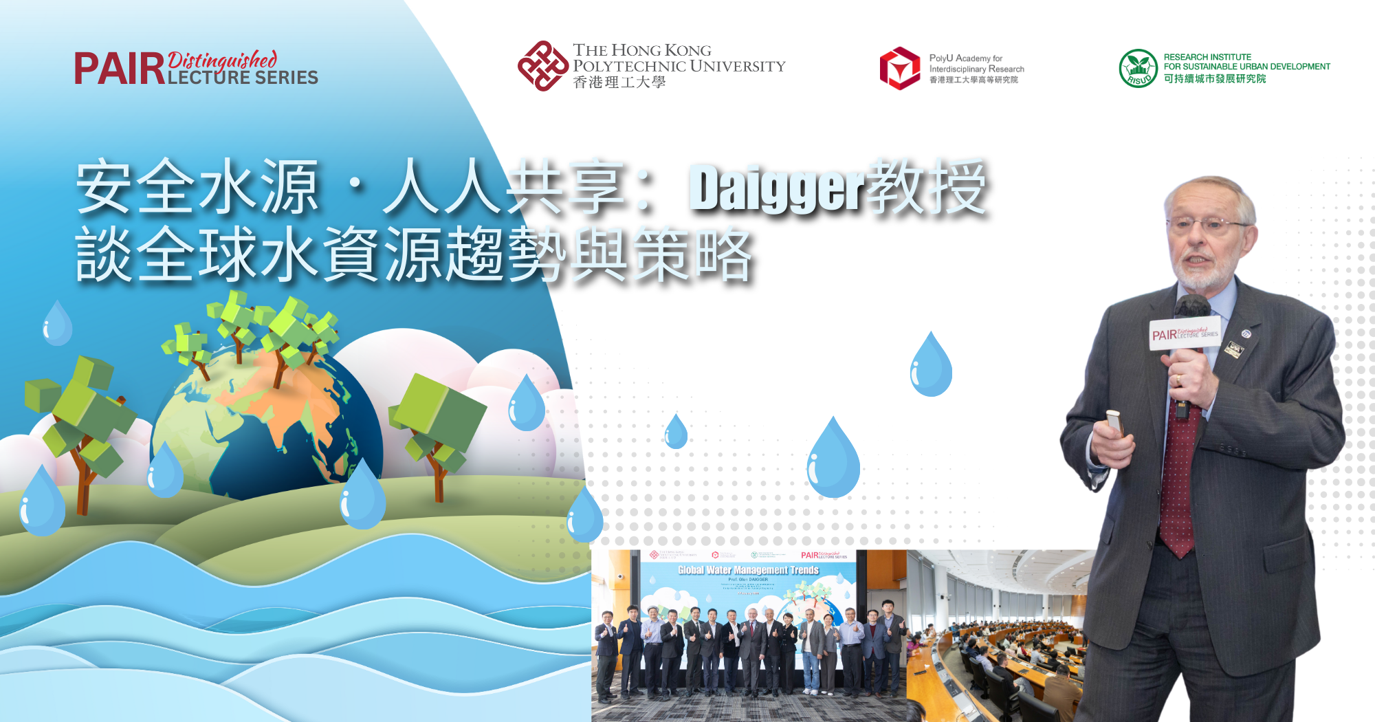 2026年2月2日,來自美國密歇根大學的Glen DAIGGER教授應邀蒞臨理大校園,主講以「全球水資源管理趨勢」為題的理大高等研究院傑出學人講座。活動吸引逾110名現場觀眾參與,及超過16,900名網上觀眾透過各大社交媒體平台同步收看,反響熱烈。
