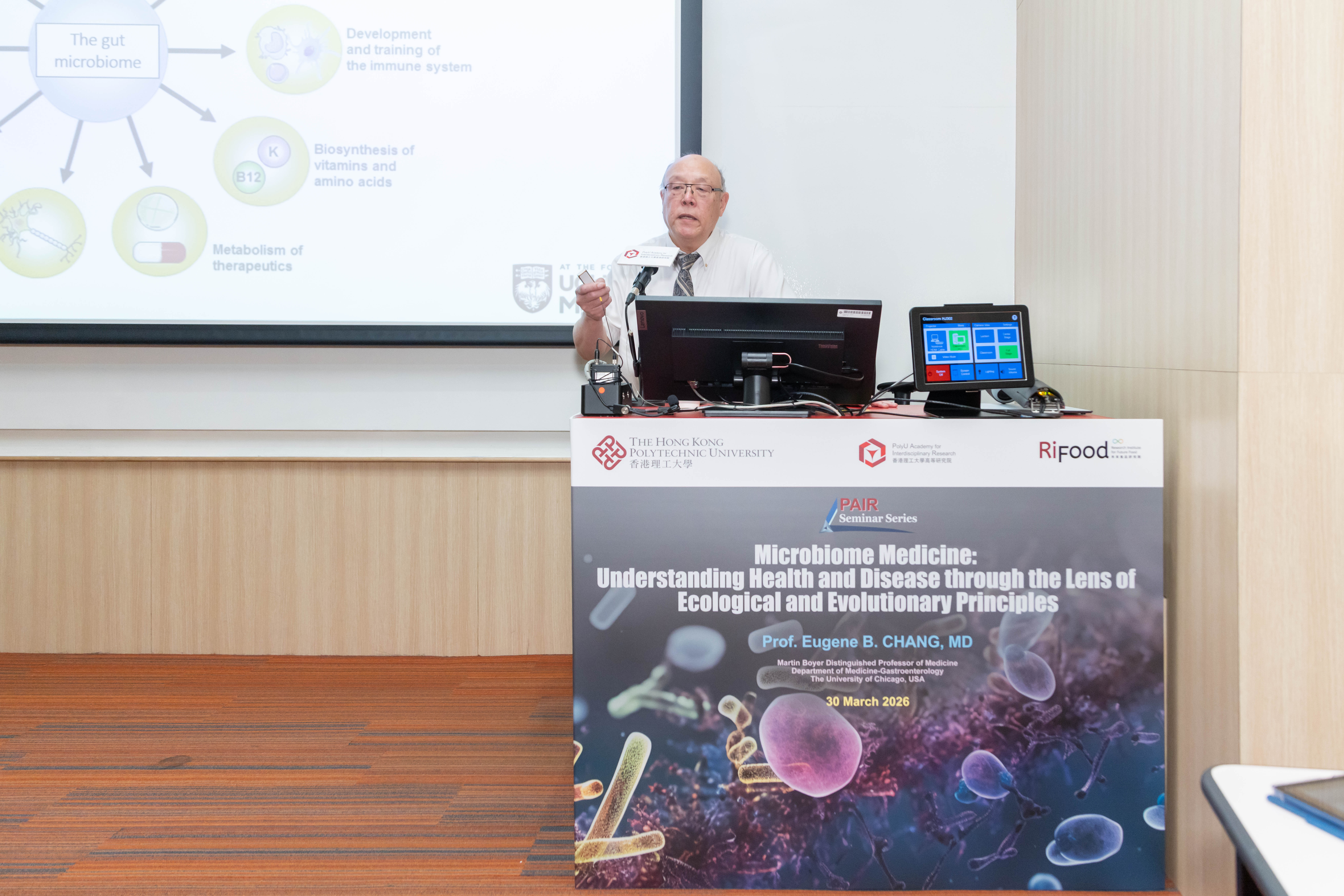On 30 March 2026, Prof. Eugene B. CHANG, Martin Boyer Distinguished Professor at the University of Chicago (UChicago), delivered a PAIR Distinguished Lecture, titled “Microbiome Medicine: Understanding Health and Disease through the Lens of Ecological and Evolutionary Principles” at the PolyU campus. The seminar drew nearly 100 researchers, clinicians and students joining onsite, and over 15,400 online viewers across various social media platforms to learn about the burgeoning field of the “gut microbial organ.