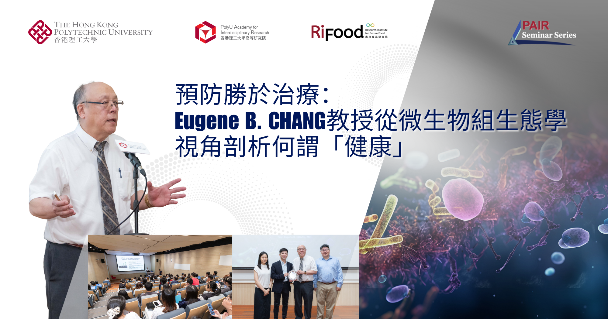 2026年3月30日,芝加哥大學 Martin Boyer 傑出教授 Eugene B. CHANG教授應邀蒞臨理大校園,主講以「微生物醫學:以生態與演化視角探究健康與疾病」為題的理大高等研究院講座。是次講座吸引了近100名研究人員、臨床醫護人員及學生參與,並有超過15,400名觀眾透過各社交媒體平台線上觀看,共同探討「腸道微生物群器官」這一新興醫學領域。