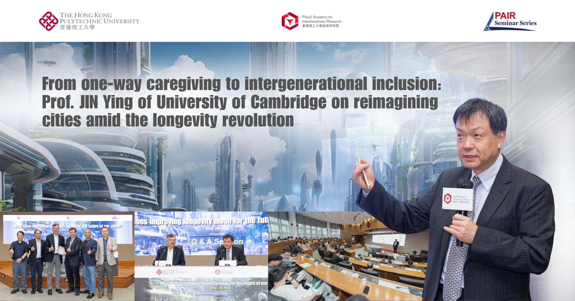 On 14 April 2026, Prof. JIN Ying, Professor of Architecture and Urbanism and Director of Studies for Robinson College of the University of Cambridge, delivered a PAIR Seminar titled “What does improving longevity mean for the future of our cities?” at the PolyU campus. The seminar attracted nearly 100 entrepreneurs, scholars, researchers and students joining onsite, and over 16,400 online viewers across various social media platforms to explore how the global “longevity revolution” is reshaping urban space, cultural activities, and socio-economic development.