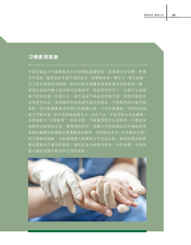 101%u7fd2%u5f97%u5ee2%u7528%u73fe%u8c61%u4e2d%u98a8%u53ef%u80fd%u6703%u4ee4%u5927%u8166%u548c%u808c%u8089%u4e4b%u9593%u7684%u795e%u7d93%u901a%u9053%u8b8a%u5f31%uff0c%u751a%u81f3%u88ab%u5b8c%u5168%u5207%u65b7%u3002%u60a3%u8005%u5728%u4e2d%u98a8%u5f8c%uff0c%u901a%u5e38%u6703%u6709%u534a%u8eab%u4e0d%u9042%u7684%u75c7%u72c0%uff0c%u5373%u611f%u5230%u8eab%u9ad4%u4e00%u5074%u4e4f%u529b%uff0c%u96e3%u4ee5%u52d5%u5f48%u3002%u70ba%u4e86%u5f4c%u88dc%u9019%u7a2e%u904b%u52d5%u969c%u7919%uff0c%u4ed6%u5011%u53ef%u80fd%u6703%u983b%u7e41%u5730%u4f7f%u7528%u8eab%u9ad4%u672a%u53d7%u5f71%u97ff%u7684%u4e00%u5074%uff0c%u6216%u7528%u5927%u808c%u8089%u4ee3%u66ff%u5c0f%u808c%u8089%u57f7%u884c%u65e5%u5e38%u52d5%u4f5c%uff0c%u4f8b%u5982%u7528%u624b%u8098%u958b%u9580%uff0c%u4ee5%u53d6%u4ee3%u7121%u6cd5%u6293%u7dca%u9580%u628a%u7684%u624b%u6307%uff1b%u4e45%u800c%u4e45%u4e4b%uff0c%u4ed6%u5011%u751a%u81f3%u4e0d%u518d%u5617%u8a66%u6d3b%u52d5%u624b%u6307%uff0c%u56e0%u4ed6%u5011%u66fe%u5617%u8a66%u904e%u800c%u5f92%u52de%u7121%u529f%u3002%u96d6%u7136%u795e%u7d93%u7cfb%u7d71%u5176%u5f8c%u53ef%u80fd%u958b%u59cb%u7652%u5408%uff0c%u624b%u6307%u808c%u8089%u4ea6%u53ef%u80fd%u958b%u59cb%u53d7%u63a7%uff0c%u4f46%u4e0d%u65b7%u91cd%u8907%u4f7f%u7528%u624b%u8098%u5df2%u7d93%u523a%u6fc0%u5927%u8166%uff0c%u4ee4%u5b83%u81ea%u6211%u91cd%u7d44%u3002%u624b%u8098%u7684%u904b%u52d5%u80fd%u529b%u4e0d%u65b7%u52a0%u5f37%uff0c%u4f46%u624b%u6307%u537b%u8d8a%u4f86%u8d8a%u7121%u529b%uff0c%u9577%u6b64%u4e0b%u53bb%uff0c%u624b%u6307%u53ef%u80fd%u6703%u5b8c%u5168%u7671%u7613%uff0c%u9019%u73fe%u8c61%u7a31%u70ba%u201c%u7fd2%u5f97%u5ee2%u7528%u201d%u3002%u5be6%u9a57%u8b49%u660e%uff0c%u7fd2%u5f97%u5ee2%u7528%u662f%u53ef%u4ee5%u9006%u8f49%u7684%uff0c%u53ea%u9700%u9069%u7576%u5730%u6fc0%u6d3b%u5927%u8166%u76f8%u95dc%u6d3b%u52d5%uff0c%u91cd%u5851%u795e%u7d93%u5373%u53ef%u3002%u80e1%u535a%u58eb%u958b%u767c%u7684%u79fb%u52d5%u5f0f%u5916%u795e%u7d93%u808c%u9aa8%u7cfb%u7d71%u6a5f%u68b0%u81c2%u53ef%u6e96%u78ba%u9396%u5b9a%u9700%u8981%u5fa9%u539f%u7684%u808c%u8089%uff0c%u9006%u8f49%u7279%u5b9a%u95dc%u7bc0 ( %u5982%u624b%u8155%u548c%u624b%u6307 )%u7684%u7fd2%u5f97%u5ee2%u7528%u73fe%u8c61%u3002%u7576%u6a5f%u68b0%u81c2%u65bd%u529b%u4f86%u5e6b%u52a9%u95dc%u7bc0%u904b%u52d5%u4e4b%u969b%uff0c%u80fd%u540c%u6642%u611f%u61c9%u5230%u60a3%u8005%u8a66%u5716%u79fb%u52d5%u5df2%u5ee2%u7528%u7684%u808c%u8089%uff0c%u96a8%u5373%u4ee5%u96fb%u529b%u523a%u6fc0%u8a72%u808c%u8089%uff0c%u4ee4%u5176%u6536%u7e2e%uff0c%u5f9e%u800c%u52a0%u5f37%u5927%u8166%u904b%u52d5%u6307%u4ee4%u548c%u52d5%u4f5c%u4e4b%u9593%u7684%u9023%u7e6b%u3002%u91cd%u5851%u795e%u7d93 %u91cd%u5efa%u751f%u6d3b