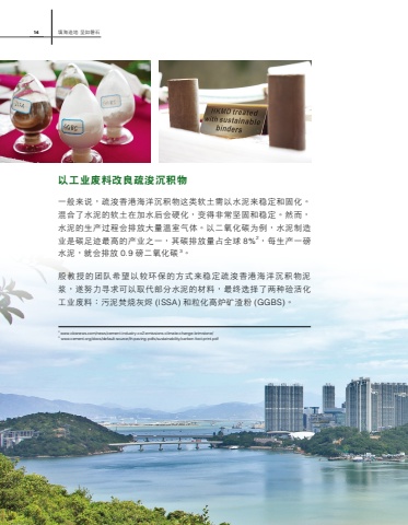 142 www.cbsnews.com/news/cement-industry-co2-emissions-climate-change-brimstone/ 3 www.cement.org/docs/default-source/th-paving-pdfs/sustainability/carbon-foot-print.pdf %u4ee5%u5de5%u696d%u5ee2%u6599%u6539%u826f%u758f%u6d5a%u6c89%u7a4d%u7269%u4e00%u822c%u4f86%u8aaa%uff0c%u758f%u6d5a%u9999%u6e2f%u6d77%u6d0b%u6c89%u7a4d%u7269%u9019%u985e%u8edf%u571f%u9700%u4ee5%u6c34%u6ce5%u4f86%u7a69%u5b9a%u548c%u56fa%u5316%u3002%u6df7%u5408%u4e86%u6c34%u6ce5%u7684%u8edf%u571f%u5728%u52a0%u6c34%u5f8c%u6703%u786c%u5316%uff0c%u8b8a%u5f97%u975e%u5e38%u5805%u56fa%u548c%u7a69%u5b9a%u3002%u7136%u800c%uff0c%u6c34%u6ce5%u7684%u751f%u7522%u904e%u7a0b%u6703%u6392%u653e%u5927%u91cf%u6eab%u5ba4%u6c23%u9ad4%u3002%u4ee5%u4e8c%u6c27%u5316%u78b3%u70ba%u4f8b%uff0c%u6c34%u6ce5%u88fd%u9020%u696d%u662f%u78b3%u8db3%u8de1%u6700%u9ad8%u7684%u7522%u696d%u4e4b%u4e00%uff0c%u5176%u78b3%u6392%u653e%u91cf%u4f54%u5168%u7403 8%2%uff0c%u6bcf%u751f%u7522%u4e00%u78c5%u6c34%u6ce5%uff0c%u5c31%u6703%u6392%u653e 0.9 %u78c5%u4e8c%u6c27%u5316%u78b3 3%u3002%u6bb7%u6559%u6388%u7684%u5718%u968a%u5e0c%u671b%u4ee5%u8f03%u74b0%u4fdd%u7684%u65b9%u5f0f%u4f86%u7a69%u5b9a%u758f%u6d5a%u9999%u6e2f%u6d77%u6d0b%u6c89%u7a4d%u7269%u6ce5%u6f3f%uff0c%u9042%u52aa%u529b%u5c0b%u6c42%u53ef%u4ee5%u53d6%u4ee3%u90e8%u5206%u6c34%u6ce5%u7684%u6750%u6599%uff0c%u6700%u7d42%u9078%u64c7%u4e86%u5169%u7a2e%u9e7c%u6d3b%u5316%u5de5%u696d%u5ee2%u6599%uff1a%u6c61%u6ce5%u711a%u71d2%u7070%u71fc (ISSA) %u548c%u7c92%u5316%u9ad8%u7210%u7926%u6e23%u7c89 (GGBS)%u3002%u586b%u6d77%u9020%u5730 %u5805%u5982%u78d0%u77f3