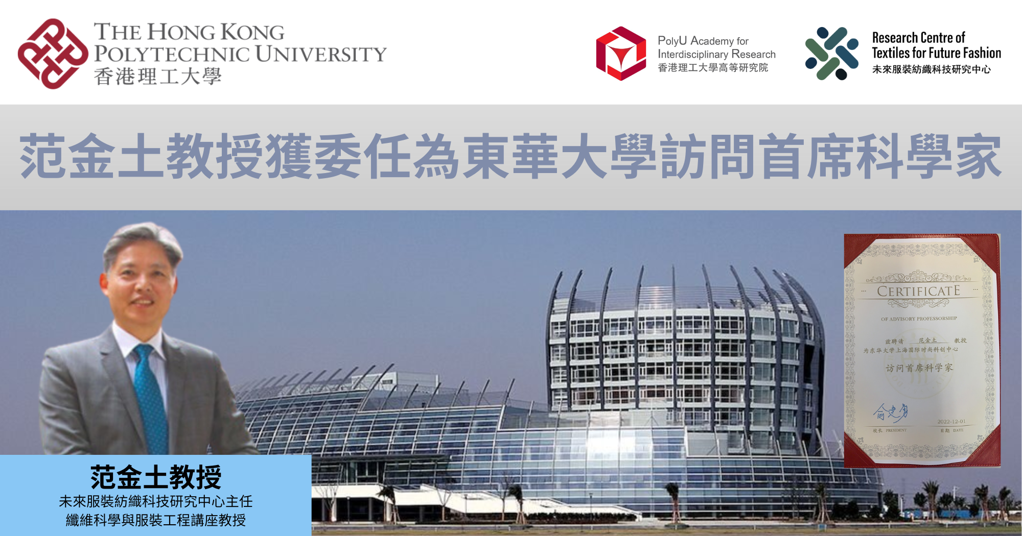 未來服裝紡織科技研究中心主任兼纖維科學與服裝工程講座教授范金土,獲委任為東華大學上海國際時尚科創中心訪問首席科學家,任期由2023 年 6 月 1 日起至 2026 年 5 月 31 日止,為期三年 。