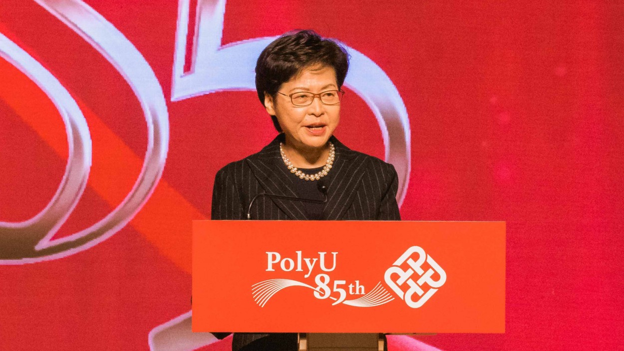 行政长官林郑月娥女士在典礼上致辞时表示,理大以创新发明享誉国际,已成为全球高等教育界重要学府之一。 "理大一直致力追求卓越,持续提升学术与科研水平,成绩有目共睹。" 她还赞赏理大为粤港澳大湾区培育创科人才,帮助年轻人在区内创业并推展多项计划。对於理大筹备在佛山设立分校,她表示: "我深信该分校将会促进香港以至整个大湾区在创新和创业方面的发展…... 我准备好为此提供支持并协助理大的筹备工作。"