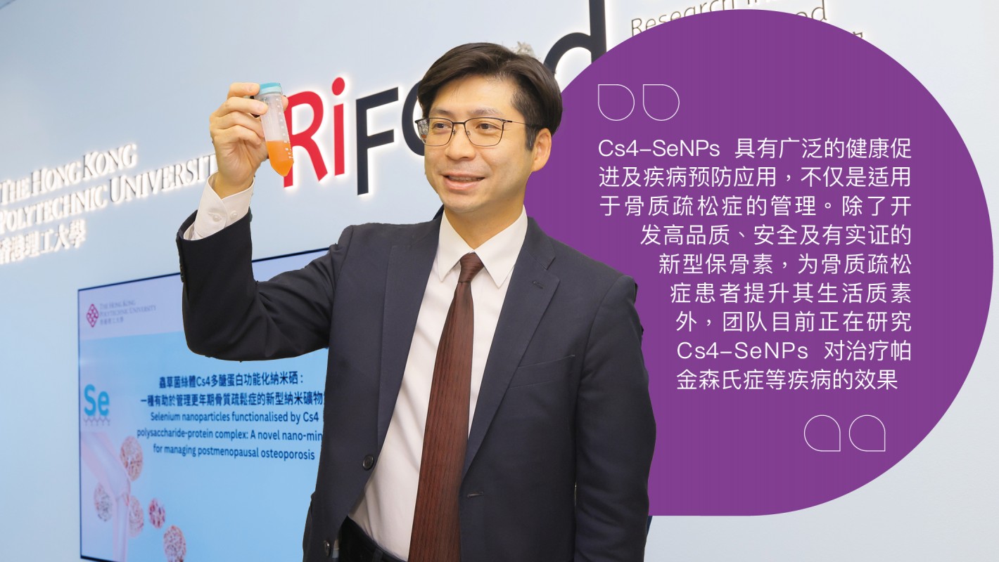 团队目前已开展与本地企业合作,研发相关的保健品并推出市场。⿈教授表示 Cs4-SeNPs 具有广泛的健康促进及疾病预防应用,不仅是适用于⾻质疏松症的管理。除了开发高品质、安全及有实证的新型保⾻素,为⾻质疏松症患者提升其生活质素外,团队目前正在研究 Cs4-SeNPs 对治疗帕金森氏症等疾病的效果,希望能透过跨学科合作,挖掘其潜在的生物医学价值,从而进一步推动相关领域的研究和应用。