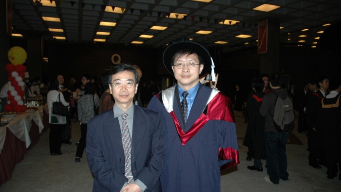 譚博士在理大修讀期間,獲李榮彬教授、工程師(左)悉心指導。李教授是理大知識管理及創新研究中心創始總監,現為榮休教授(製造工程學)。