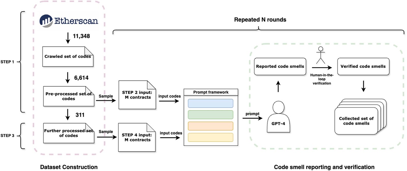 The second step involves the preliminary identification and categorisation of code smells. Here, the team employed the initial prompt framework to guide GPT-4 in analysing selected contract segments. Due to input length constraints, it experimented with different strategies for presenting code to the model, such as removing trivial functions and focusing on longer, more complex code blocks. The outputs from GPT-4 were then manually verified by experienced blockchain developers, who assessed the validity and novelty of each reported code smell.