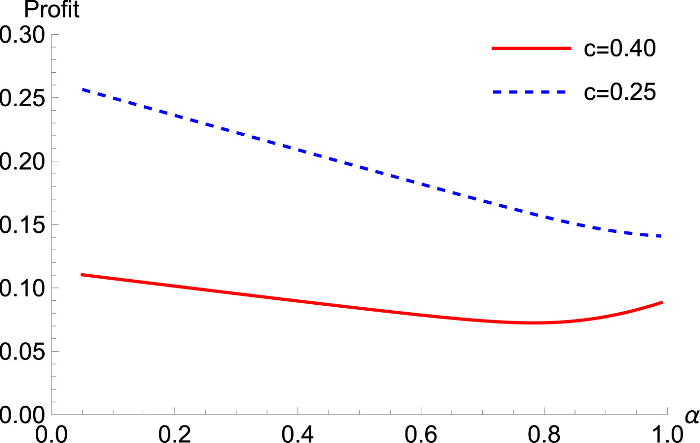 Figure 2. The retailer's profit in the BC model. c denotes the cost of the good.