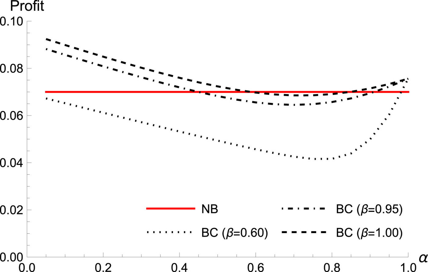 The retailer's profit under blockchain adoption exhibits a U-shaped relationship with the information disclosure level (Figure 2). When α is very small or very large, blockchain adoption can increase retailer's profit. At small α, the main benefit comes from improved salvage value due to traceability; while at large α, the retailer can charge higher prices to informed consumers and reduce returns. However, at intermediate levels of α, blockchain adoption may reduce profit, as too many low-valuation consumers exit the market and the retailer cannot fully exploit high-valuation consumers.