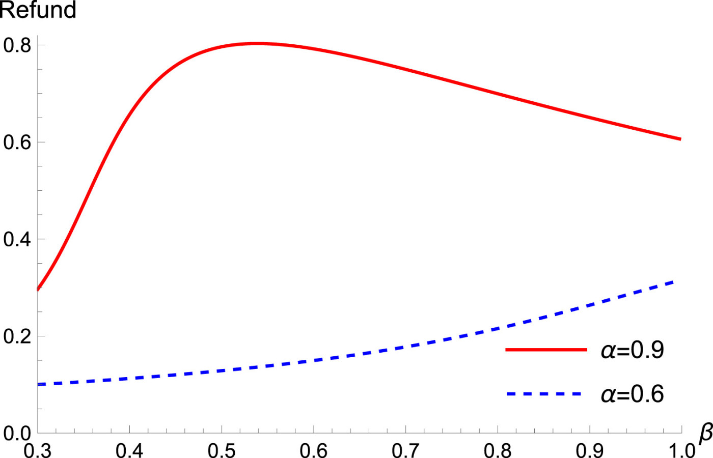 In the BC model, the optimal refund is shaped by both the information disclosure level α and the volatility discount β (Figure 1). When α is large and β is small, the retailer may offer a generous refund. This counterintuitive result arises because a generous refund can attract non-searchers despite the risk of price volatility, while the retailer can still extract surplus from informed, high-valuation consumers through higher prices.