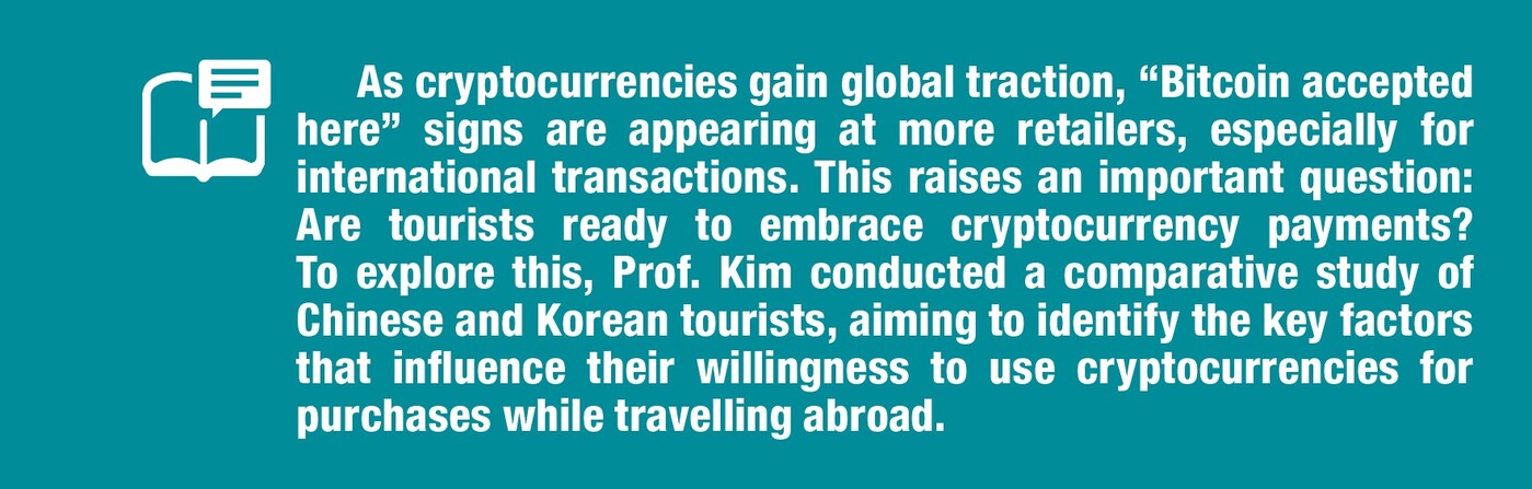 Prof. Seongseop (Sam) KIM, Professor of the School of Hotel and Tourism Management at The Hong Kong Polytechnic University, and his research team have sought to explore and compare the behavioural intentions of Korean and Chinese travellers towards adopting cryptocurrency payments, especially in relation to the already dominant mobile payment systems. The study was published in Current Issues in Tourism [1].