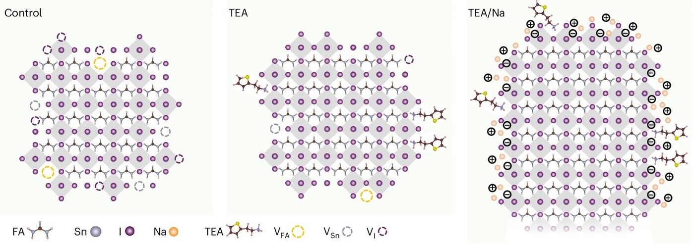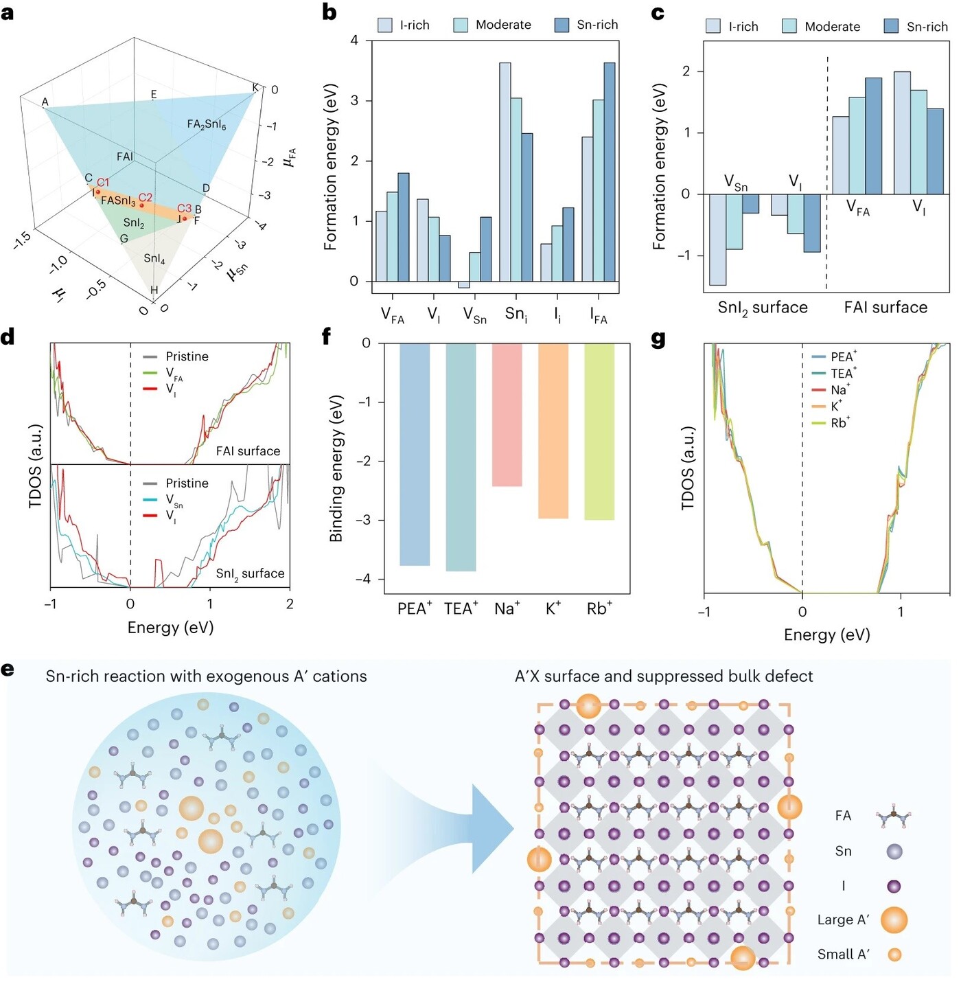 These results underscore a fundamental limitation: the chemical potentials of the constituent precursors alone cannot simultaneously suppress both bulk and surface defects. This insight led to the hypothesis that introducing exogenous monovalent cations (A′) could enable the formation of defect-tolerant A′X′ (where X′ are halides or capping ligands) surfaces under tin-rich conditions, thereby achieving dual-defect suppression (Figure 1e). The selection of suitable A′ cations was guided by computational evaluation of their binding energies and potential to introduce trap states (Figure 1f&g). TEA+ and Na⁺ emerged as optimal candidates, exhibiting favourable binding energies and no evidence of trap state formation.