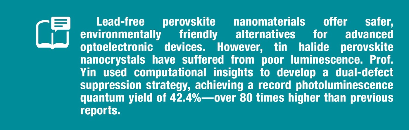 The aim of Prof. Yin’s study was to overcome the persistent challenge of low luminescence in tin halide perovskite nanocrystals, particularly in hybrid organic–inorganic systems. Previous attempts to enhance PLQY by adjusting precursor ratios or employing post-synthetic treatments have yielded limited success, with PLQYs rarely exceeding 20% and often remaining below 1% for hybrid systems. The team hypothesised that a synthesis strategy focused on dual-defect suppression, targeting both bulk and surface defects, could unlock the luminescent potential of tin perovskite nanocrystals. To this end, they employed density functional theory calculations to unravel the defect formation mechanisms in FASnI3 and designed a synthesis protocol that strategically combines tin-rich conditions with the introduction of monovalent cations such as 2-thiopheneethyl ammonium (TEA+) and sodium (Na+).