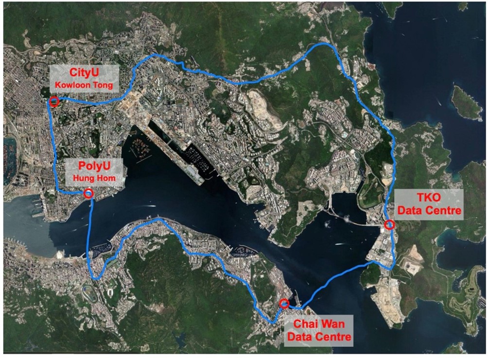 The loop can be conceived of as comprising three connected segments linking these sites: PolyU–TKO (27.12 km), TKO–Chai Wan (7.09 km), and Chai Wan–PolyU (21.20 km). In the field trial, a quantum signal was transmitted from the PolyU, travelled around the entire loop through the other nodes and returned to its starting point for measurement. This setup mimics how signals actually travel in a live urban telecom network.