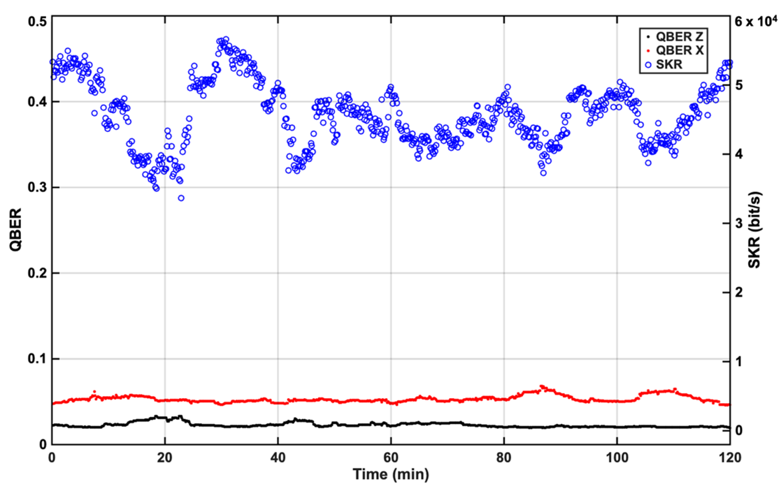 Figure 3. Measured quantum bit error rate (QBER) in Z-basis and X-basis, and secure key rate (SKR) over the two-hour quantum network testing